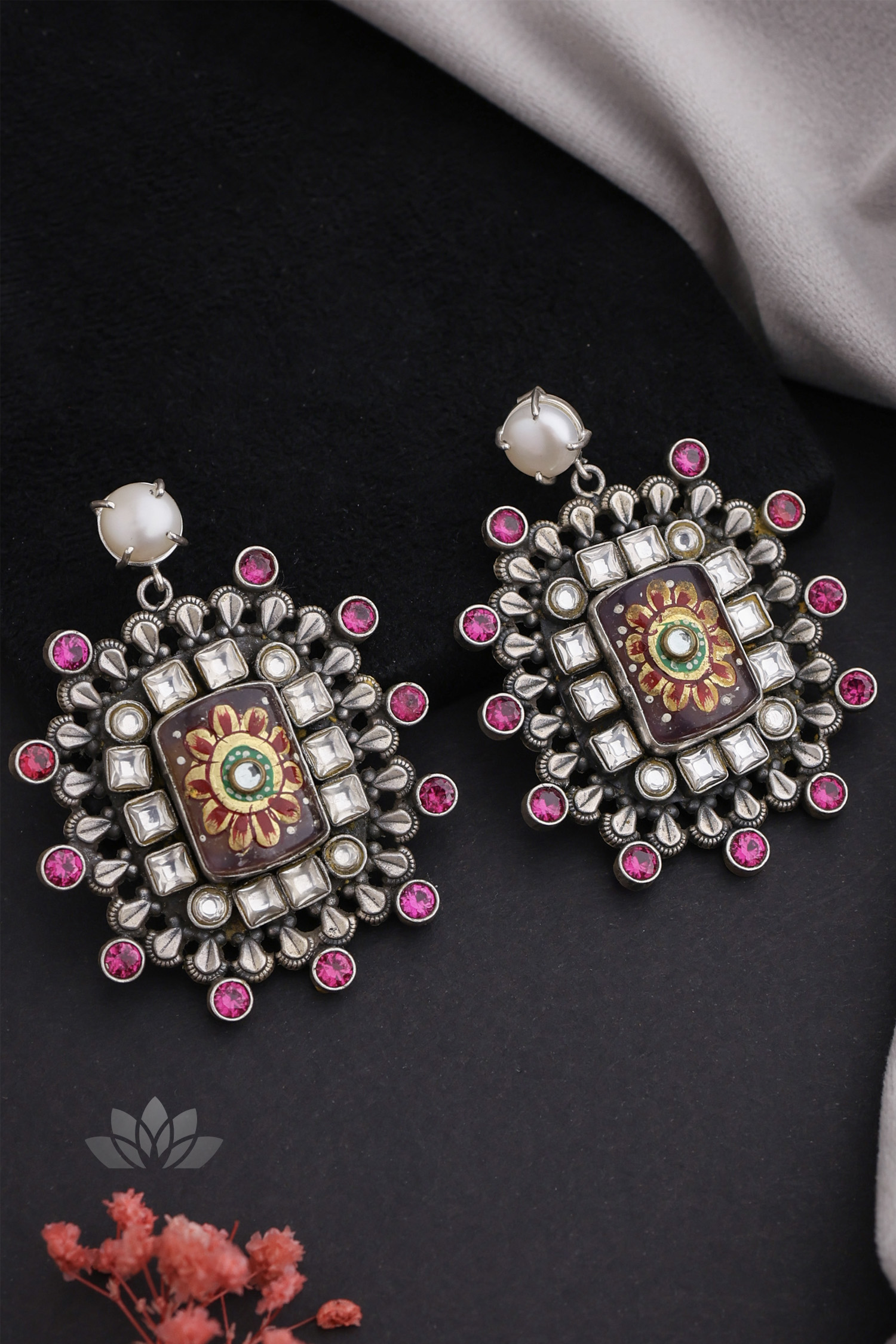 925 Silver – Statement Kundan earrings with a handpainted stone at the centre