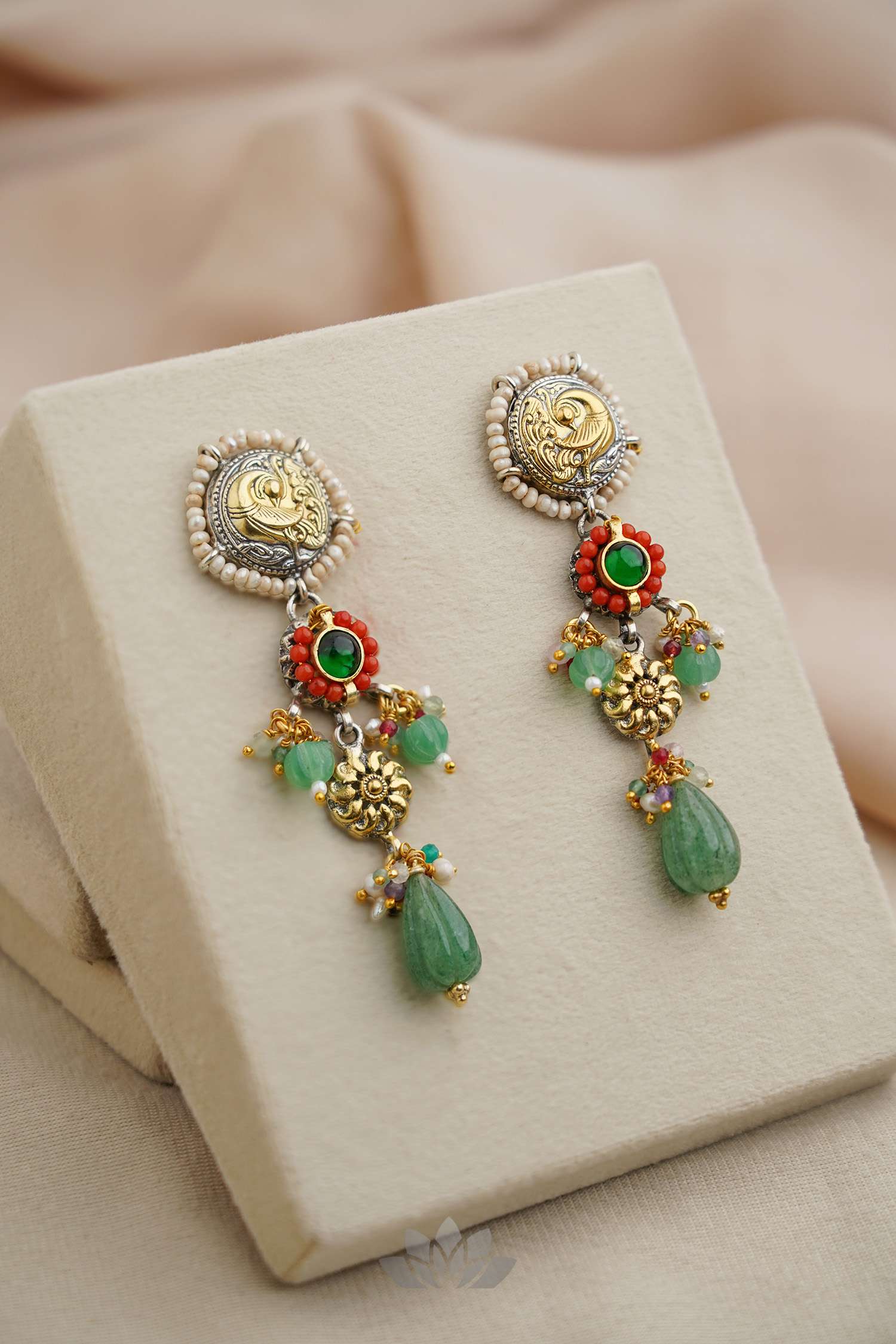 925 Silver – Dual tone statement kundan earrings with pearl and bead works and semi precious bead hangings