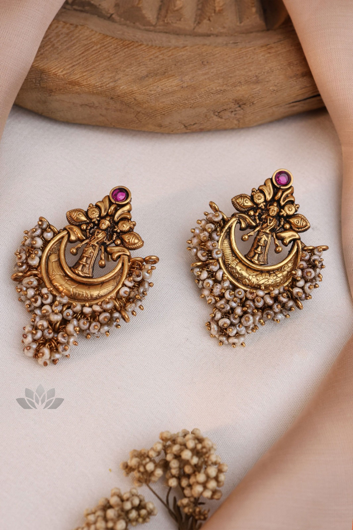 Gold plated 925 Silver – Antiqued finish chandbali earrings with bunch of pearls