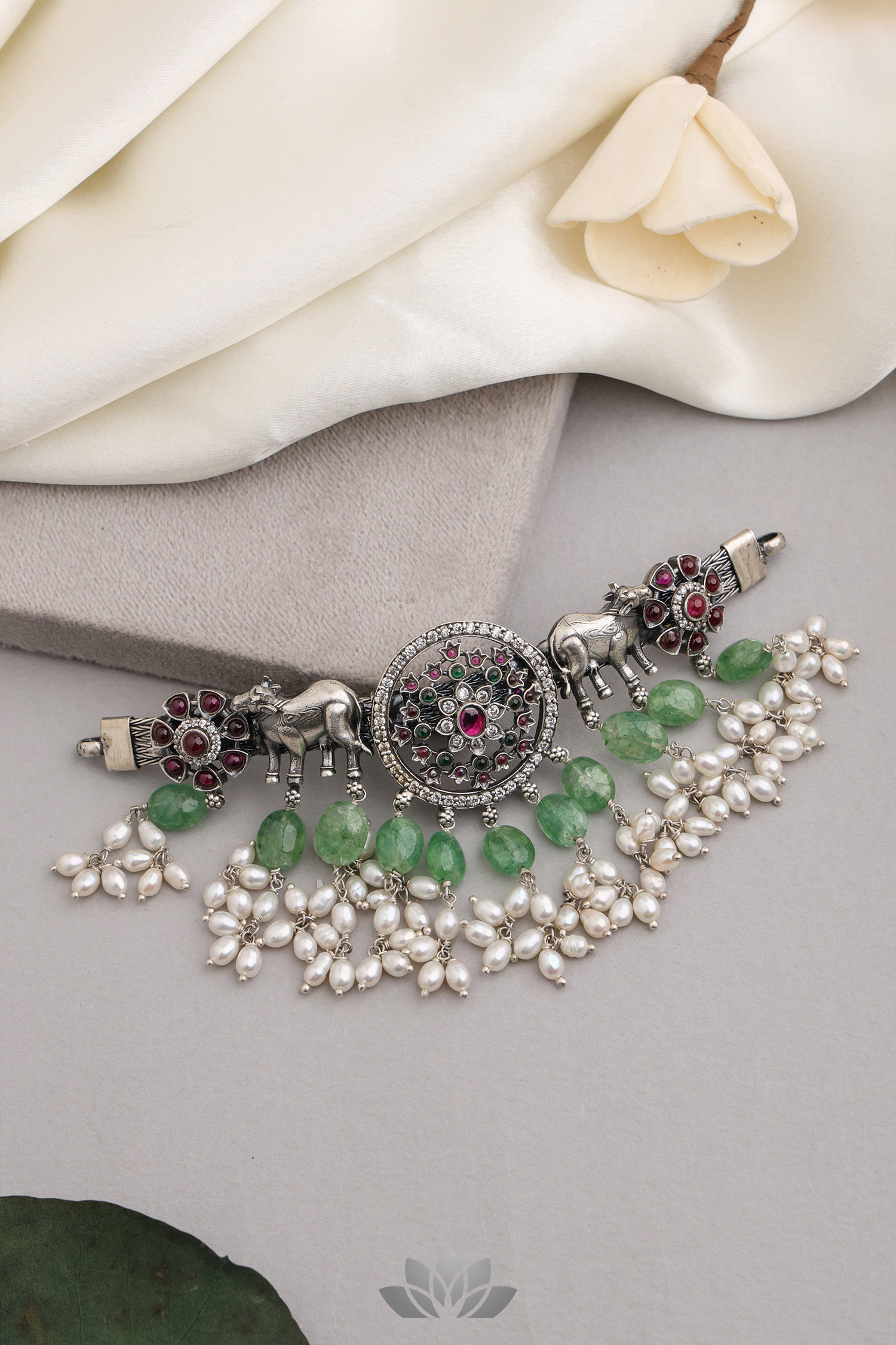 925 Silver – Kemp and Cz stone nakshi choker with pearl and bead hanging