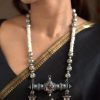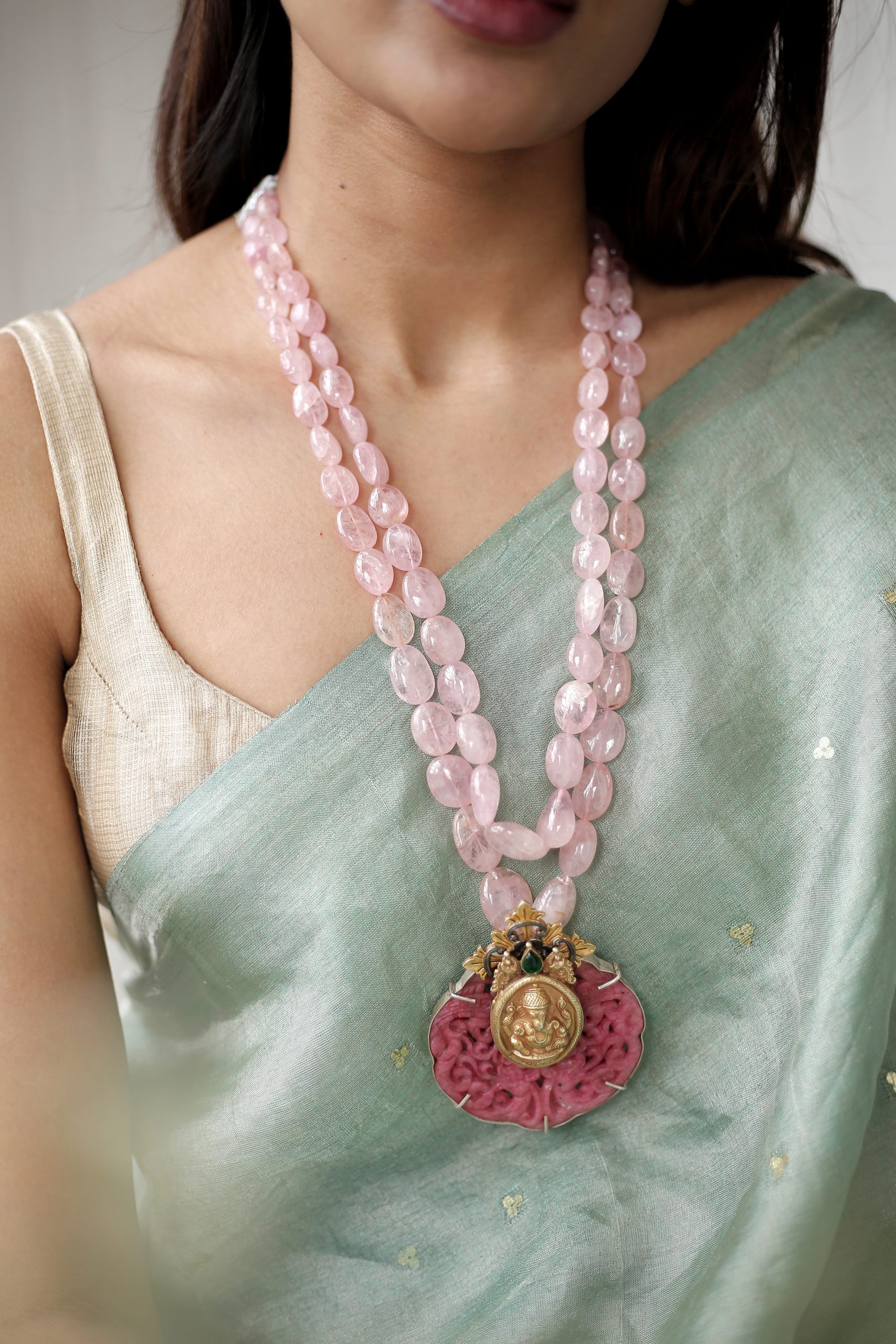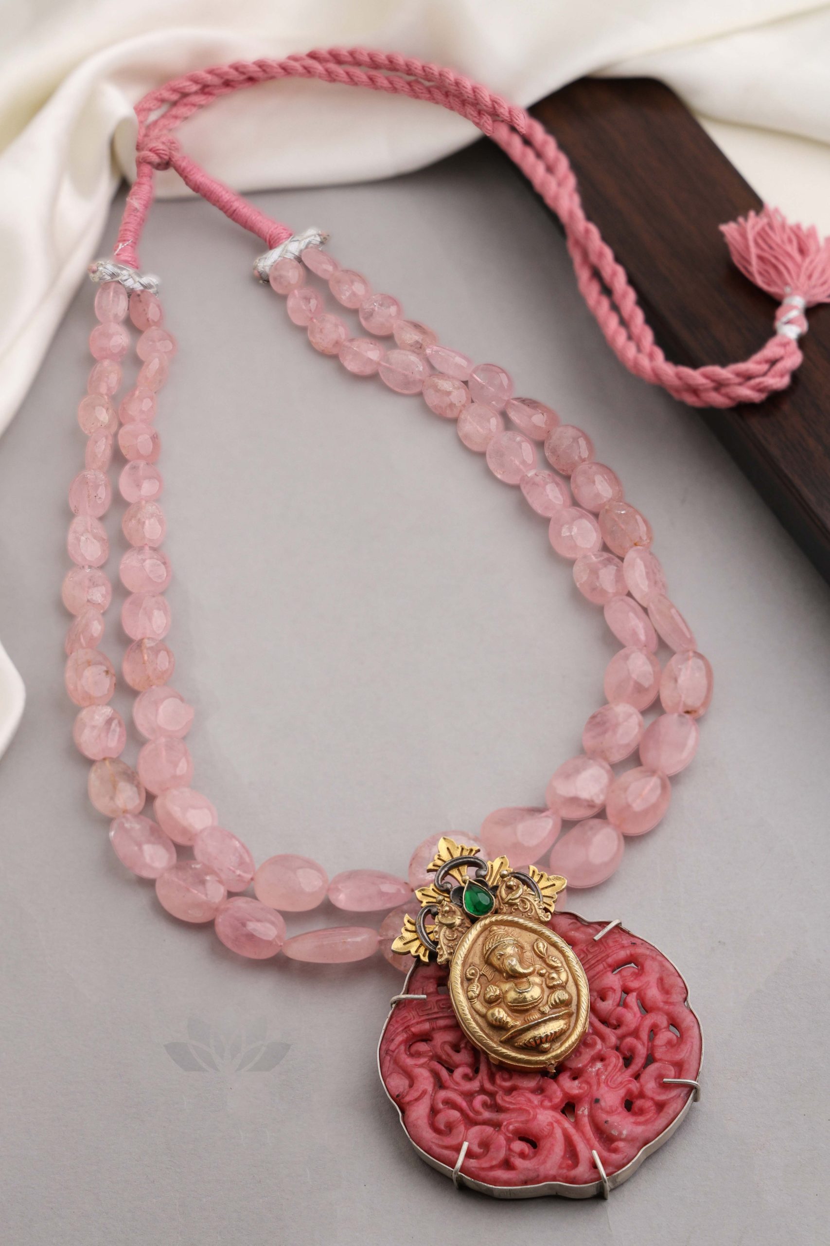 925 Silver – 2 Layer rose quartz mala with statement dual tone carved stone work with nakshi ganesha