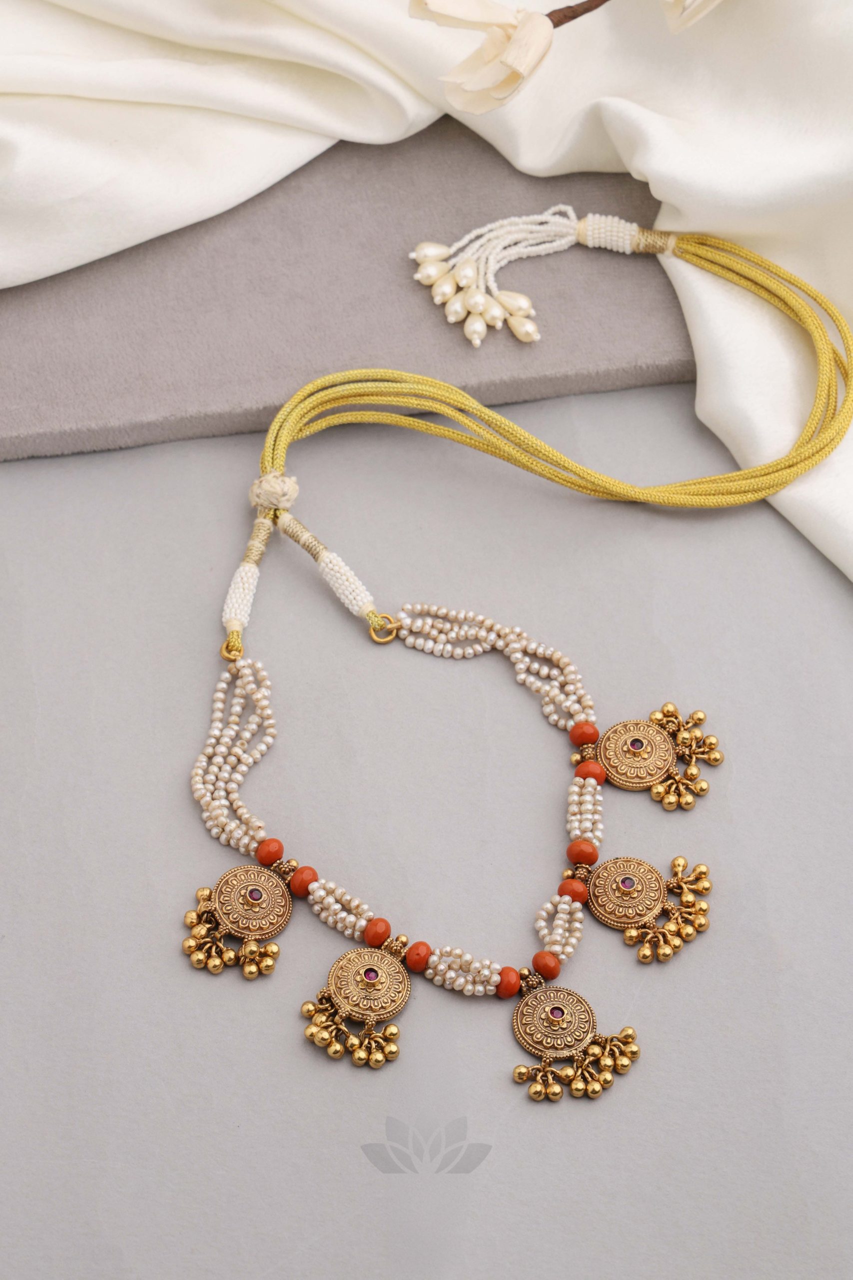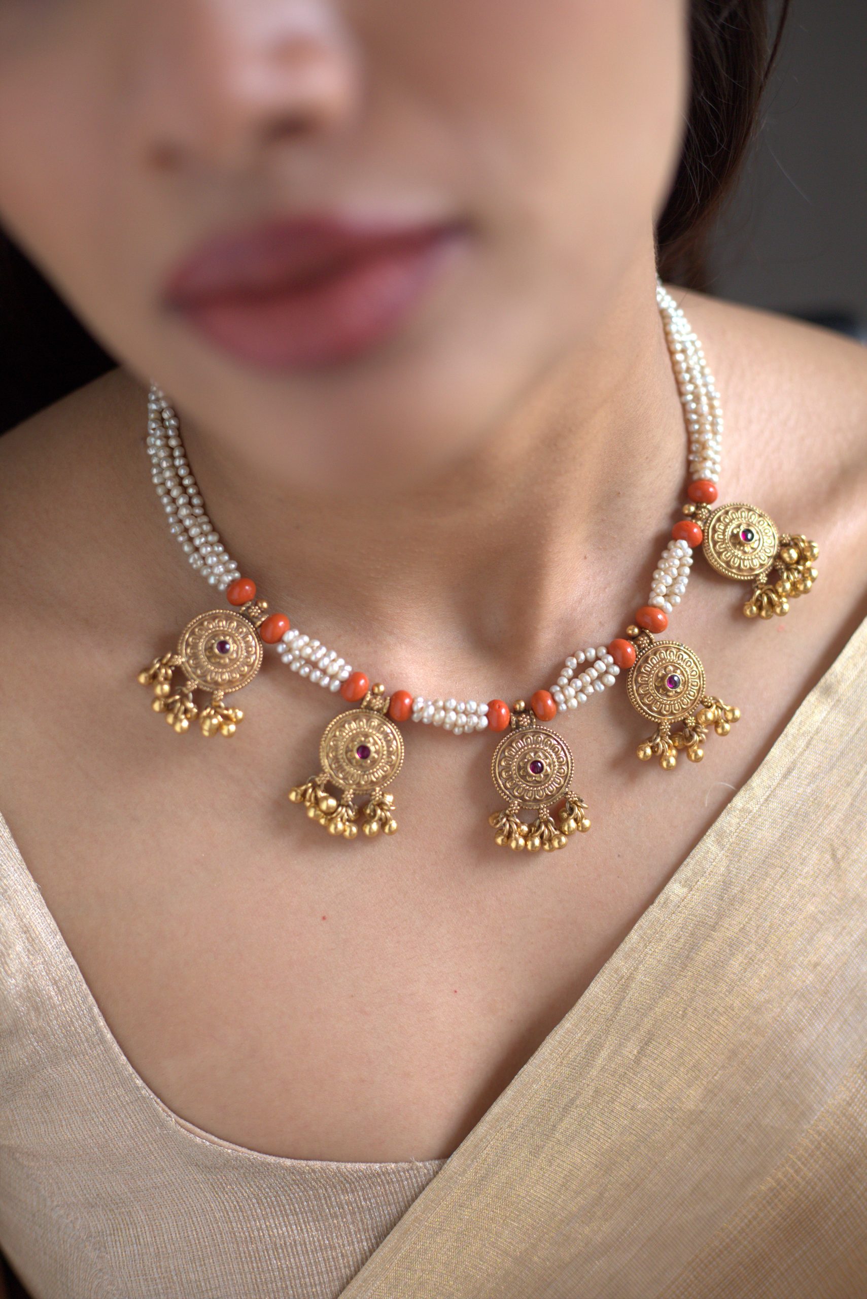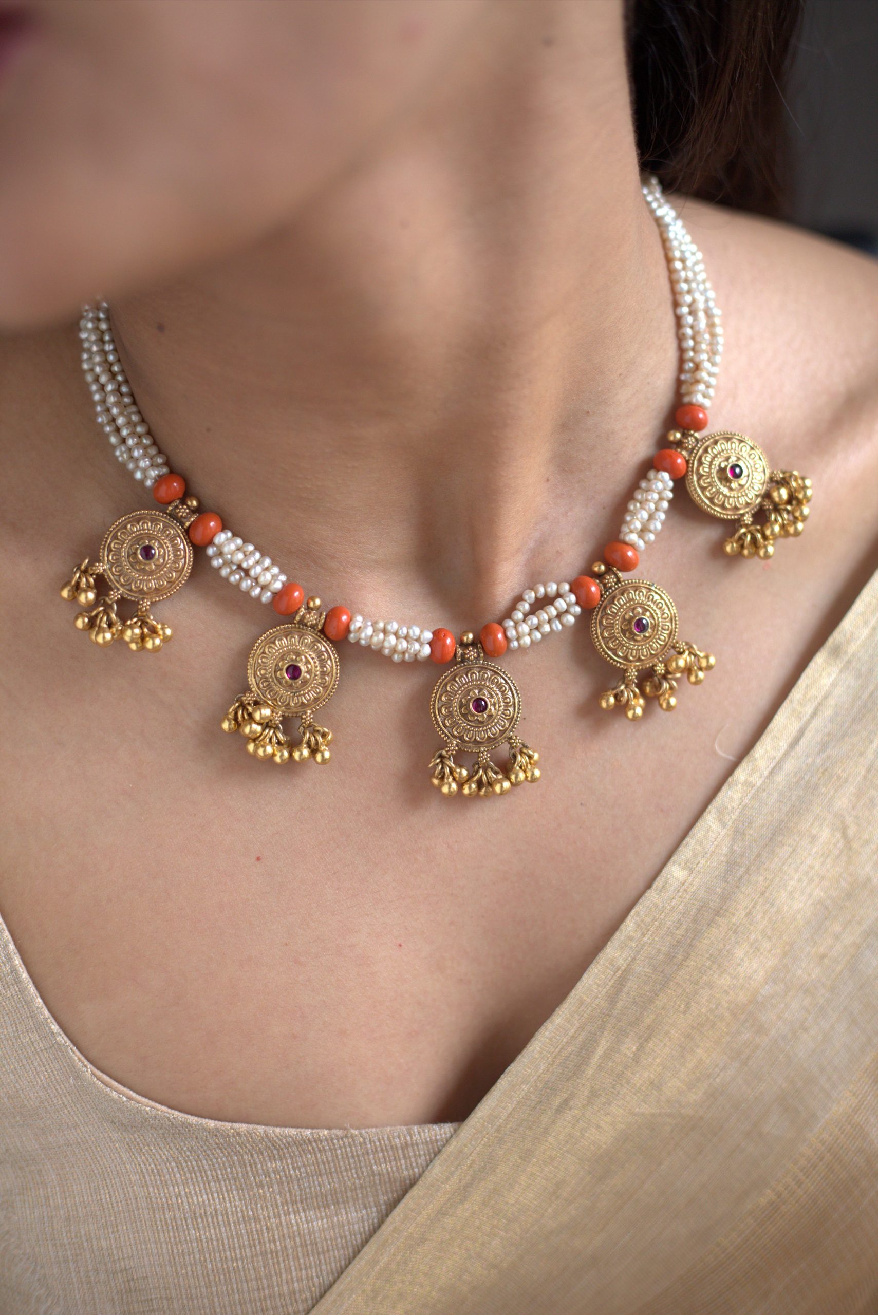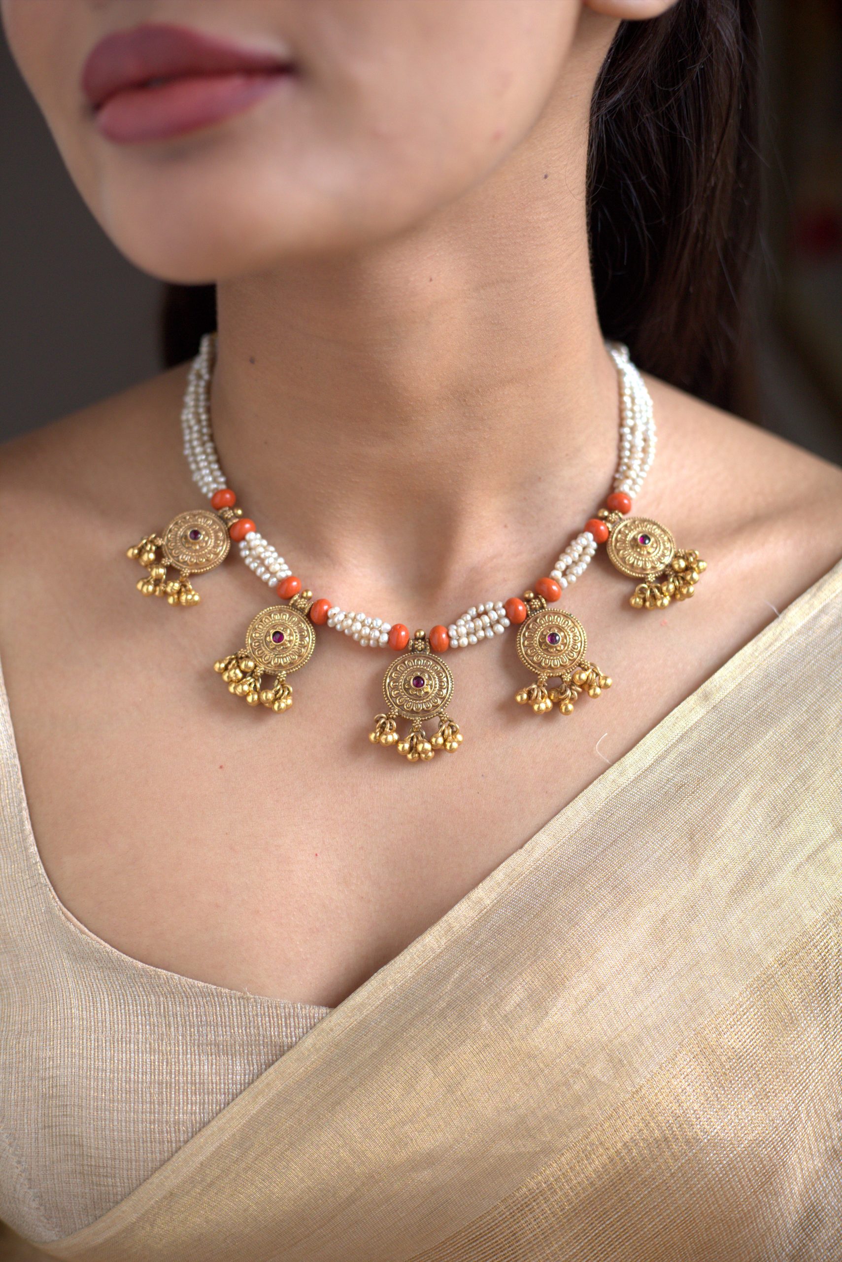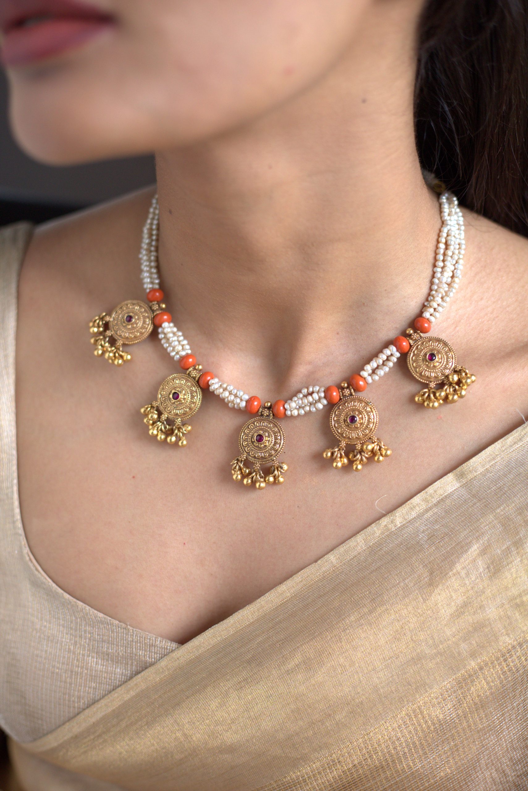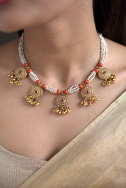 Gold plated 925 Silver – Pearl and coral choker with nakshi works