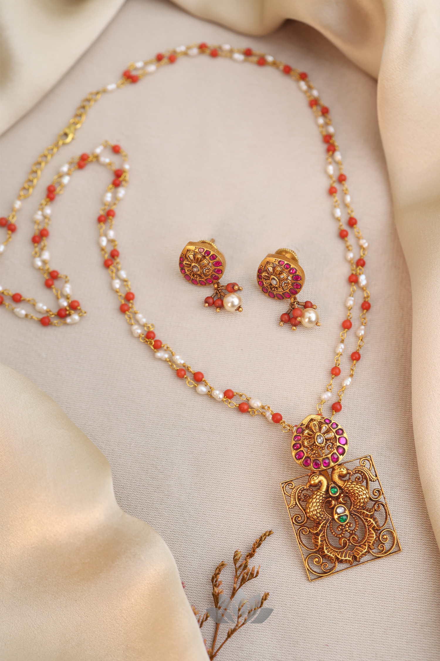 Gold plated 925 Silver – Pearl and Coral Bead Necklace Set with Kundan Nakshi works