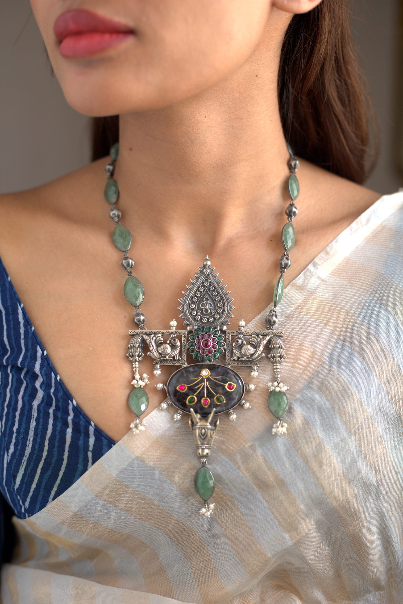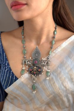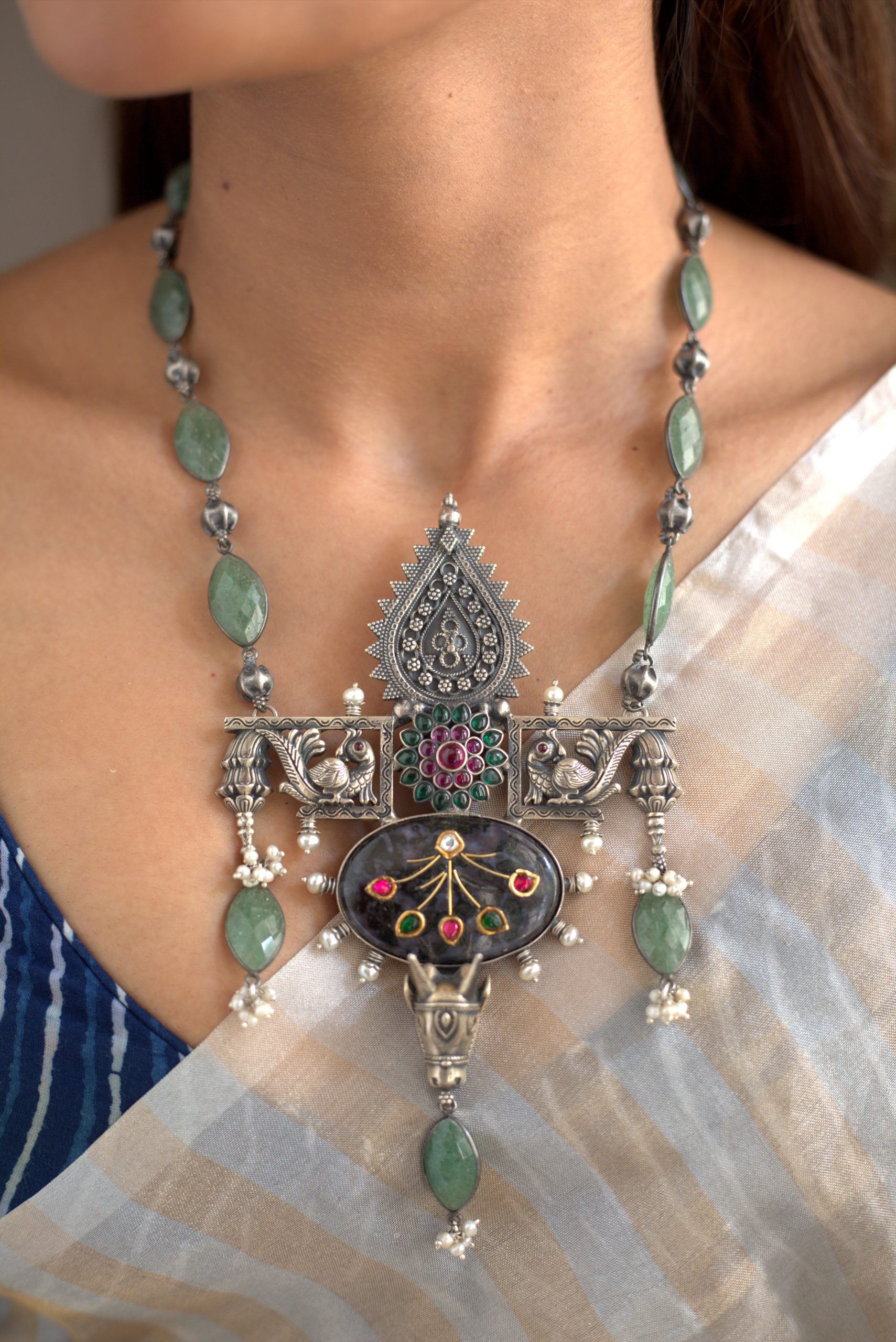 925 Silver – One of a kind statement stone necklace with kemp stone works and jadai works