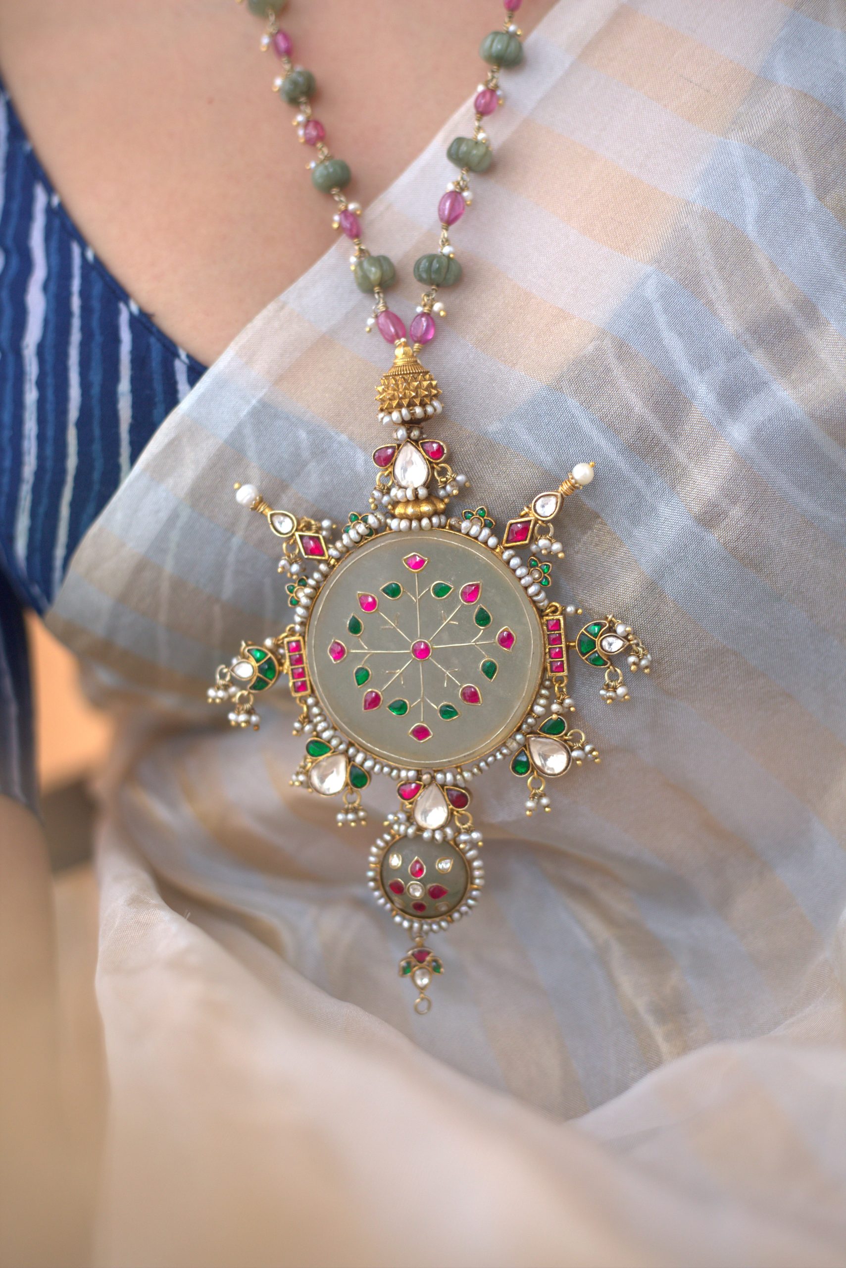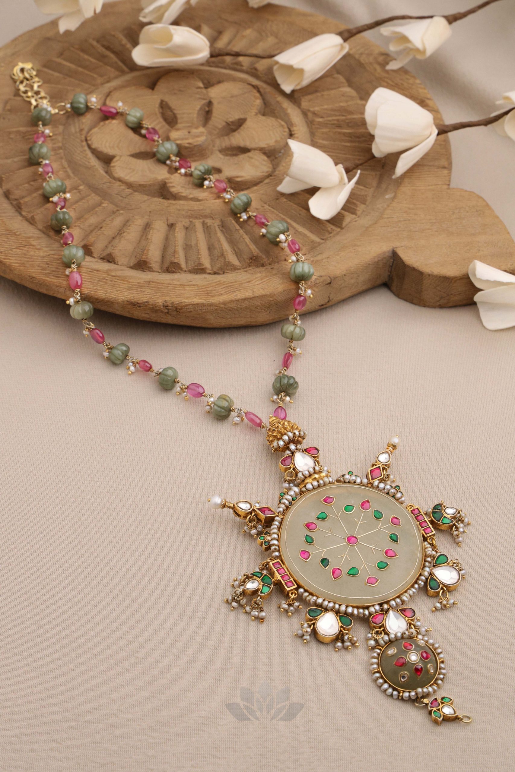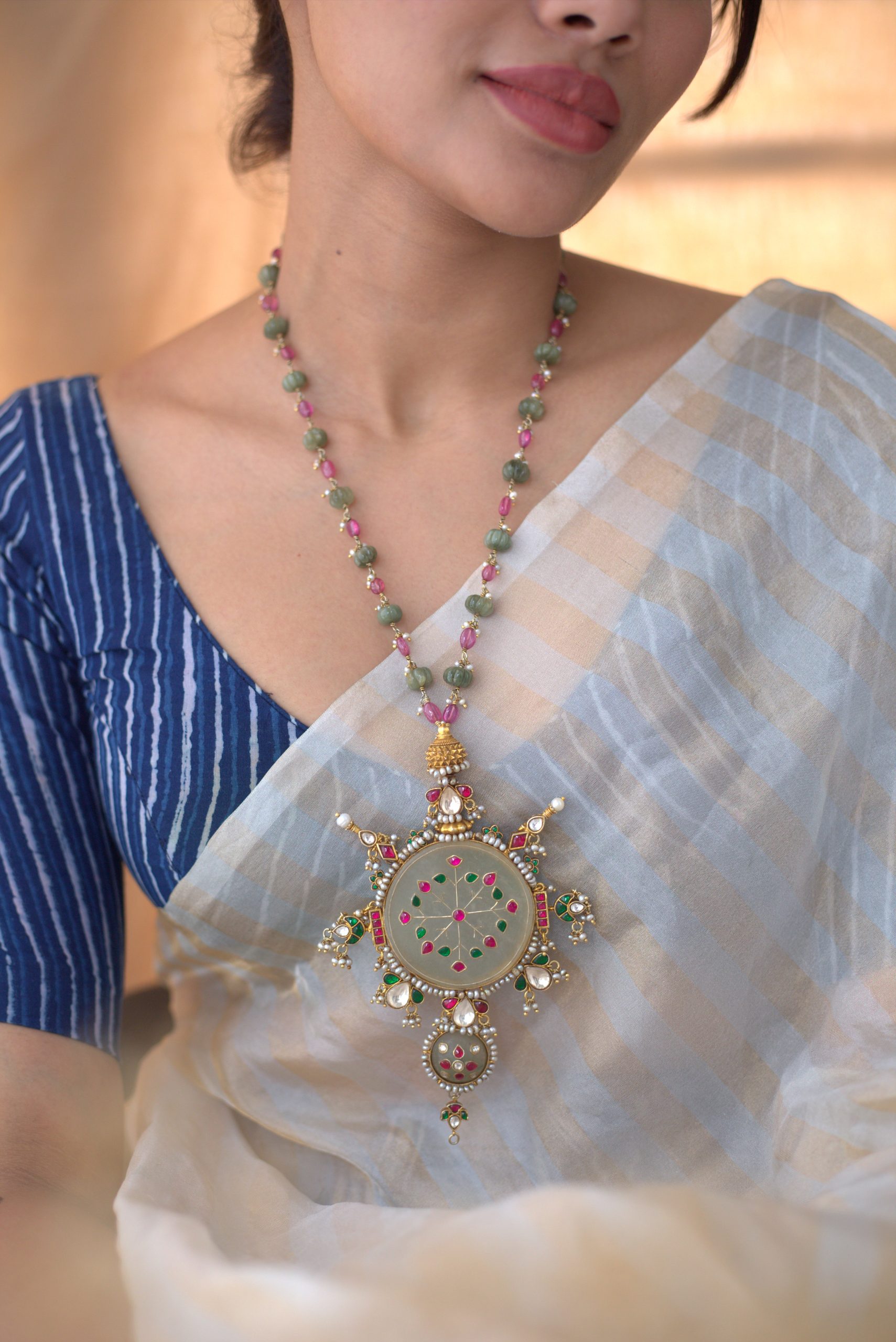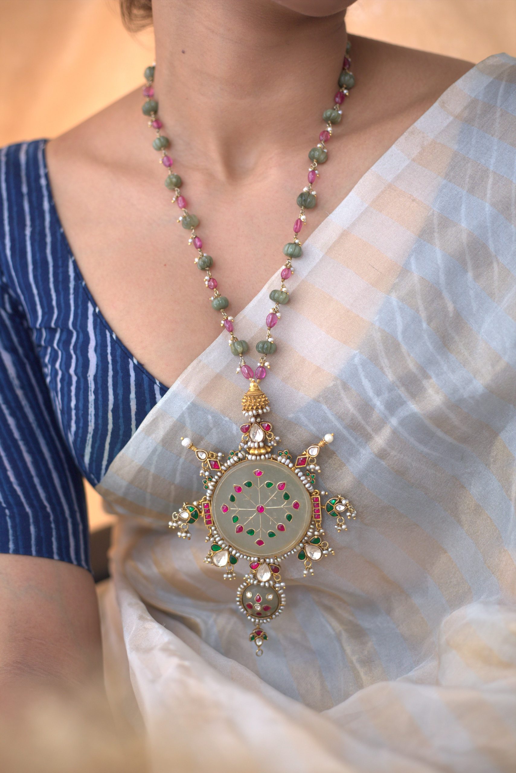 Gold plated 925 Silver – Long bead chain with stone pendant and kundan jadai works on it