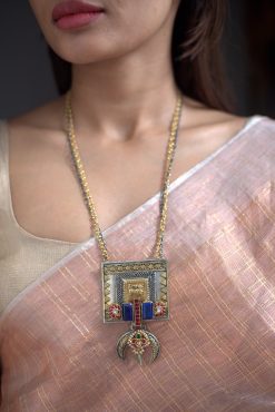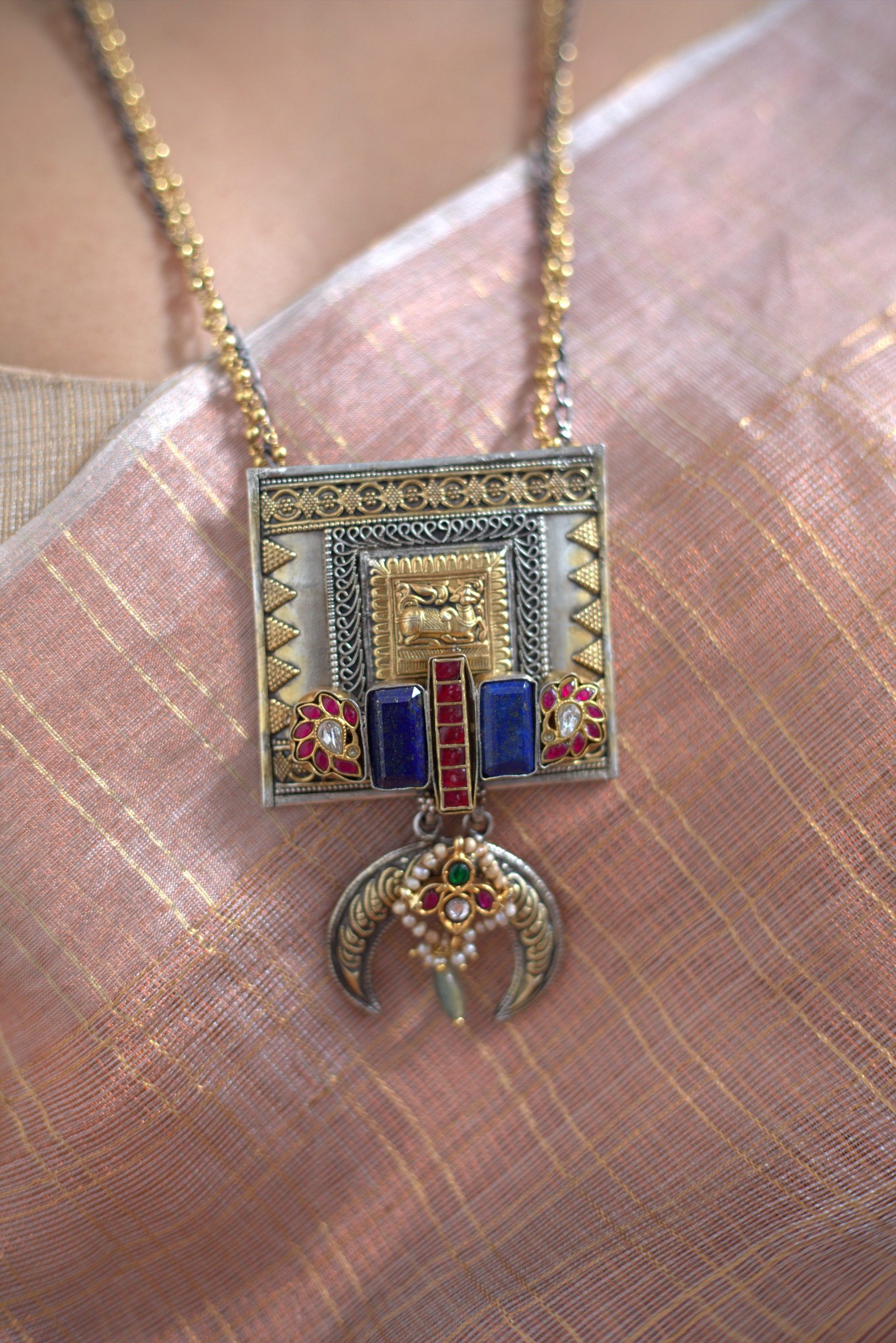 925 Silver – Dual tone long chain with statement pendant with lapis stones and kundan works