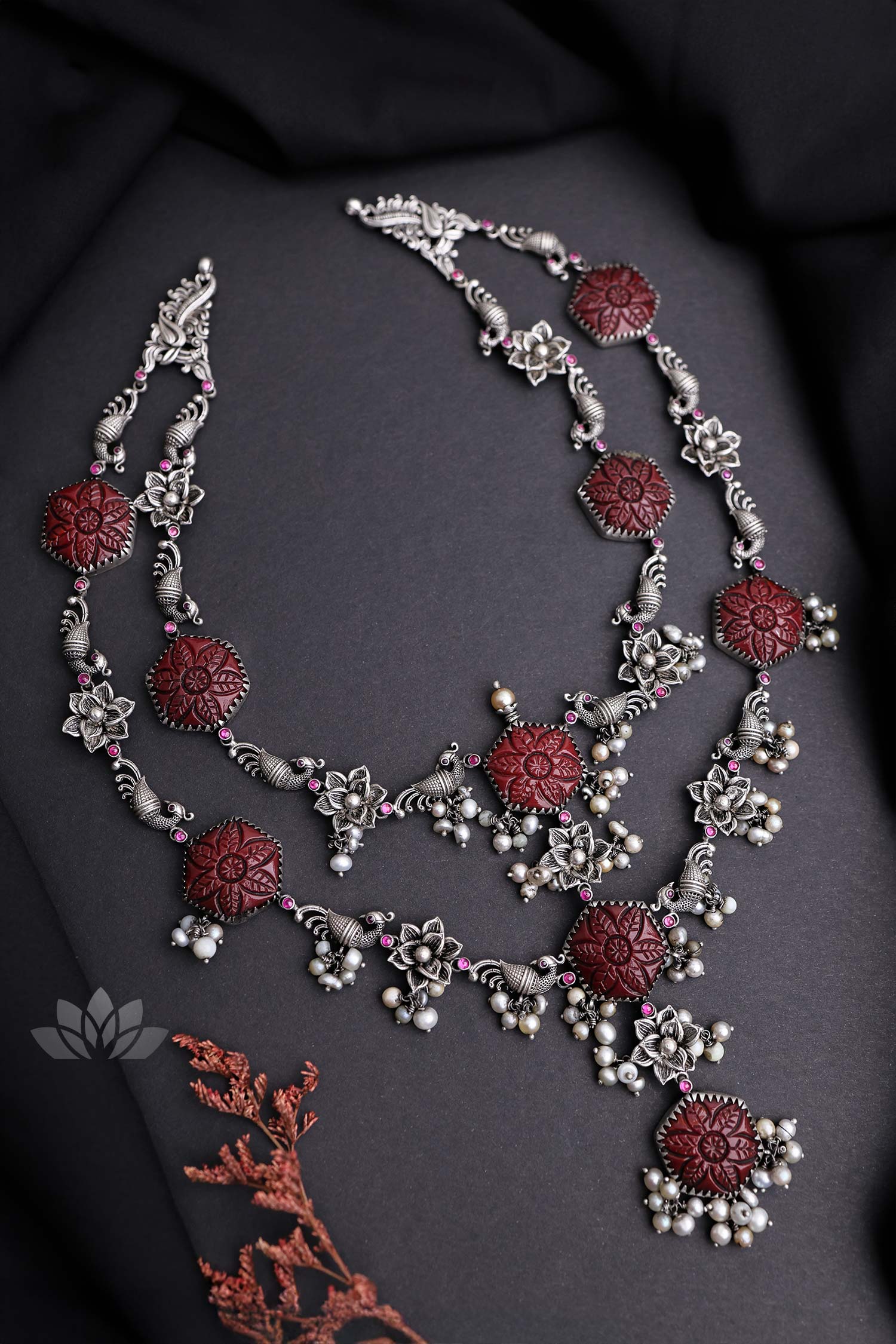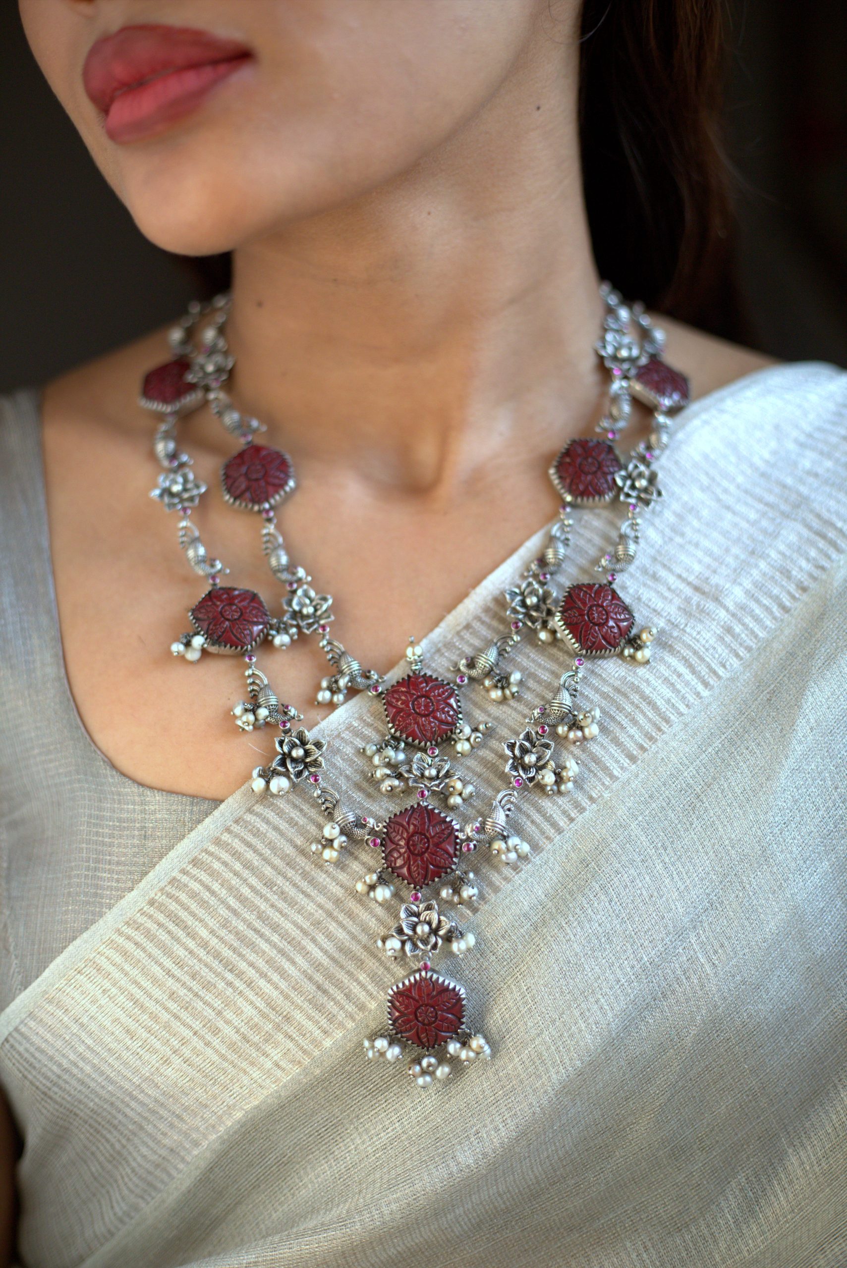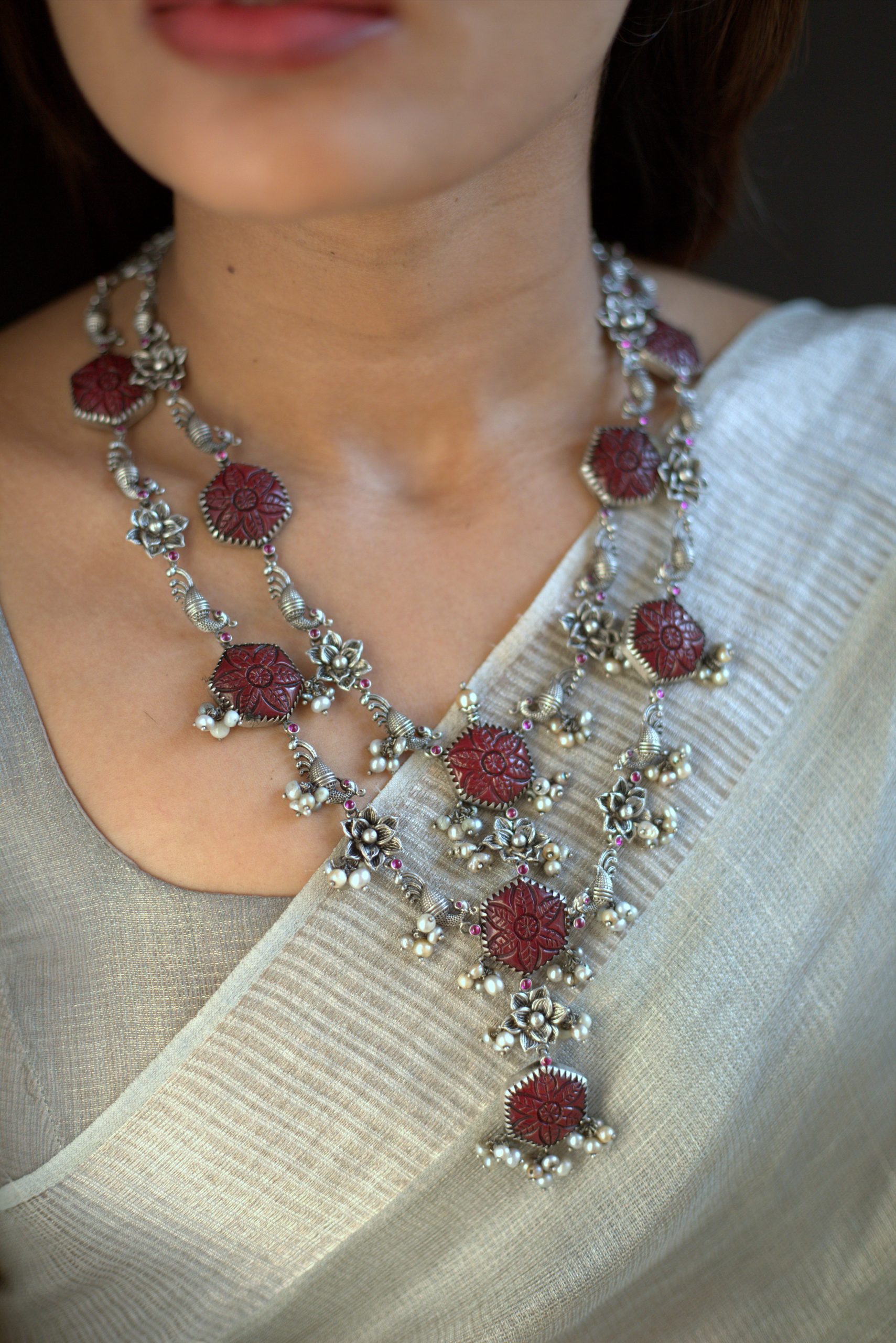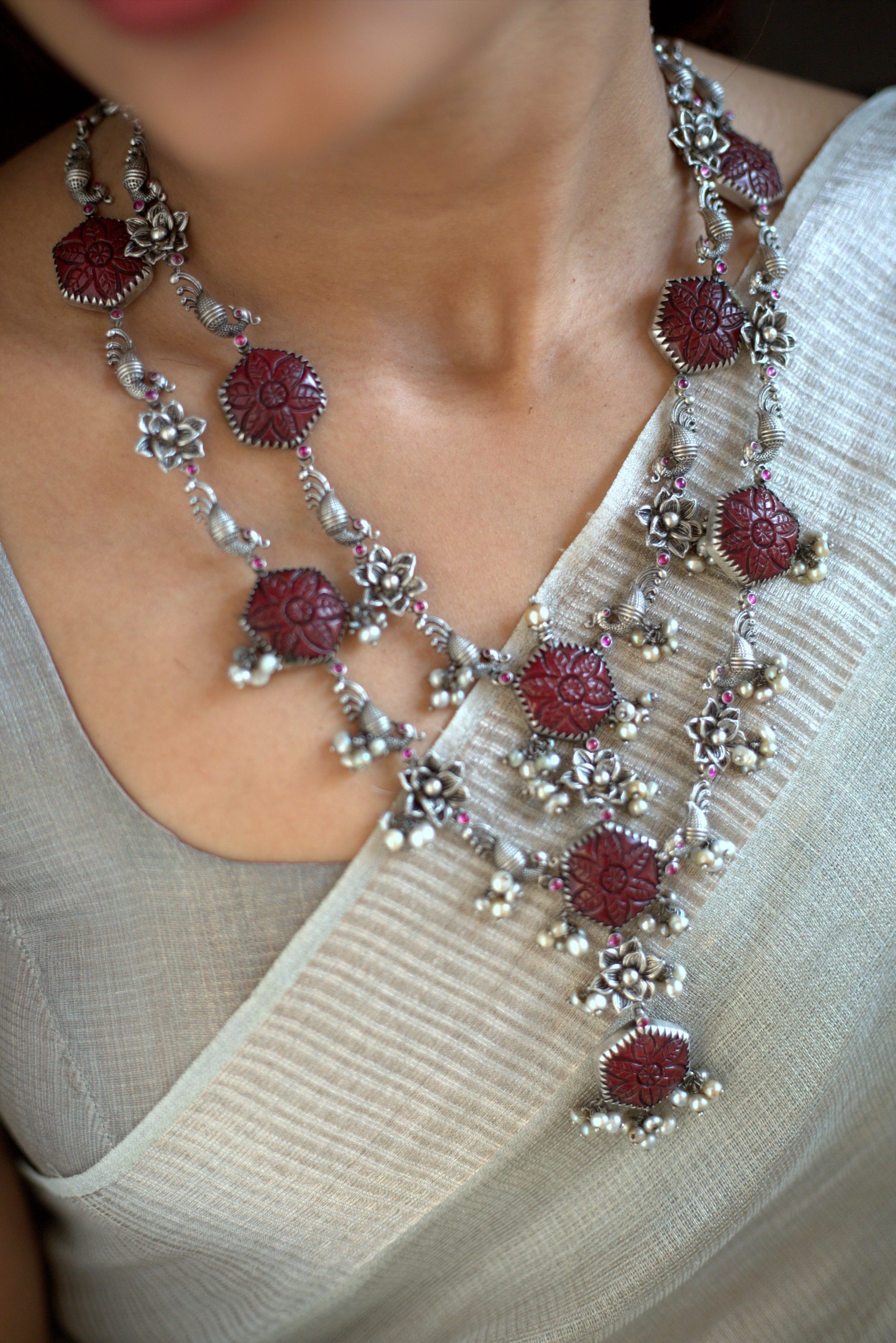 925 Silver – Carved Stone Necklace with Nakshi work