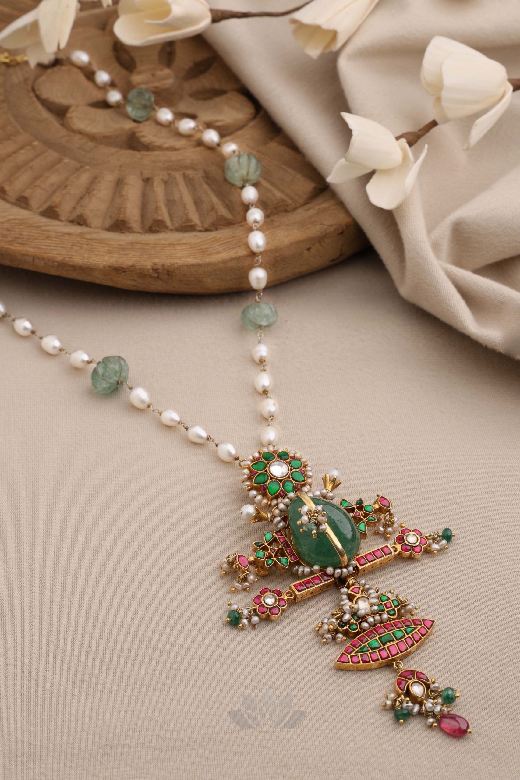 Gold plated 925 Silver – Long pearl and bead chain with stone pendant and kundan jadai works on it
