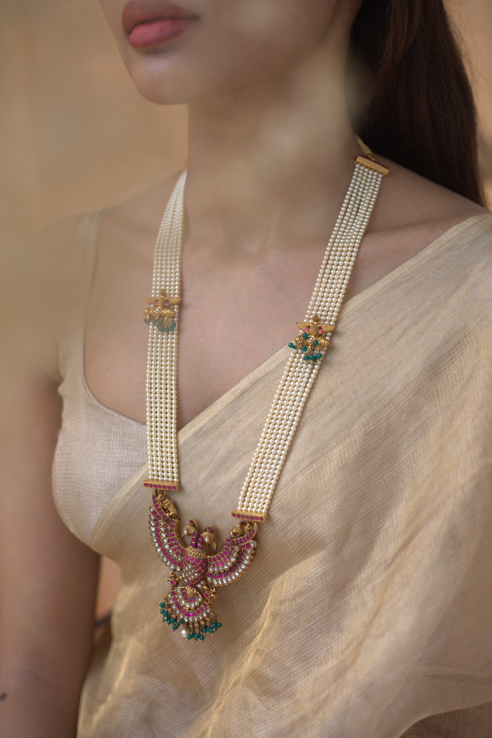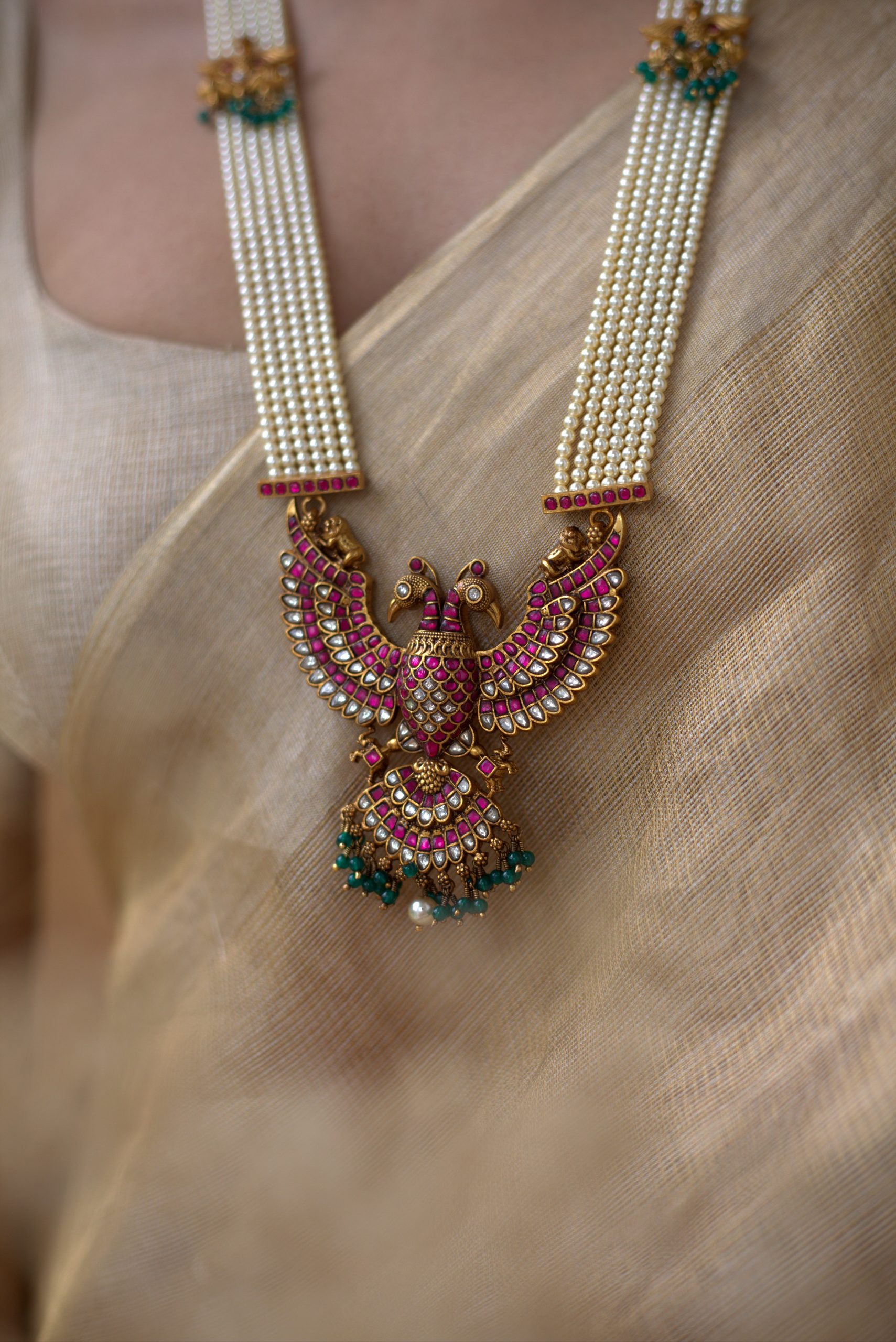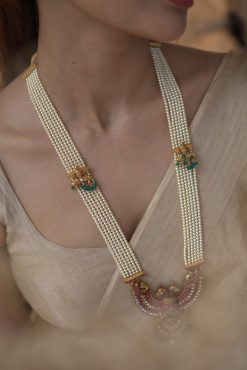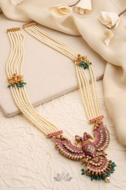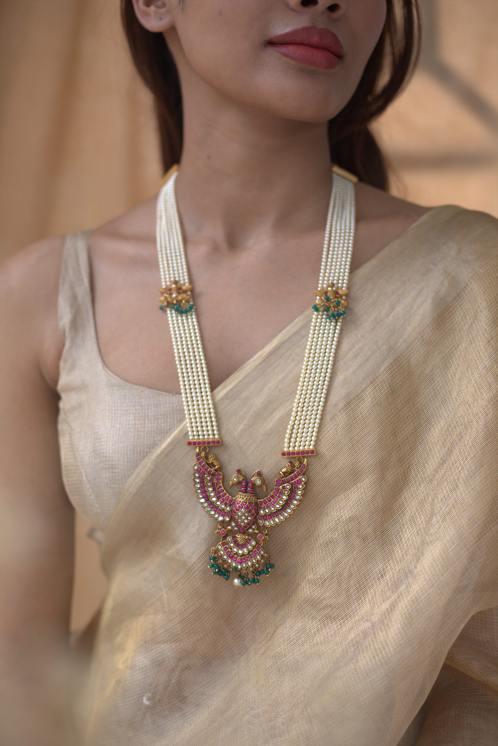 Gold plated 925 Silver – Multilayer Statement pearl gandaberunda necklace with kundan nakshi works