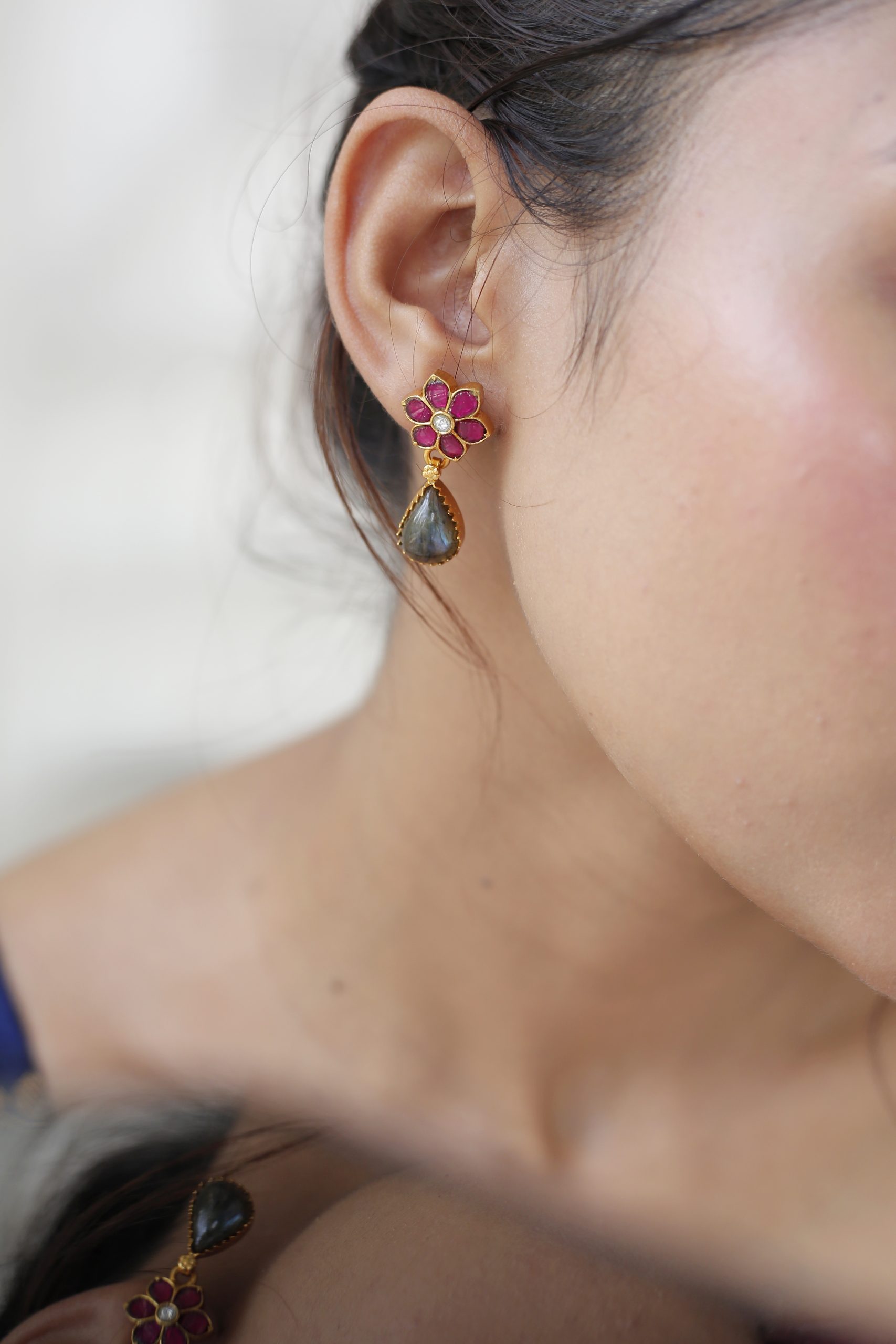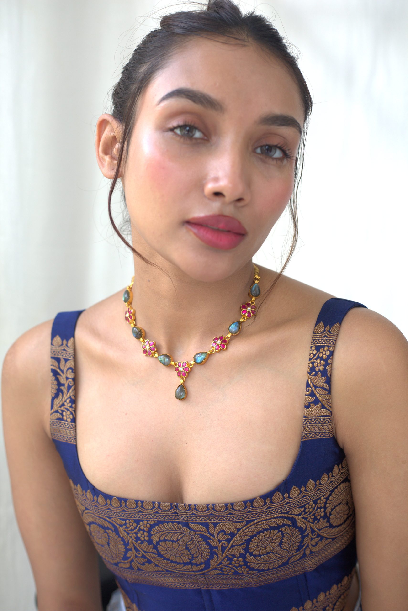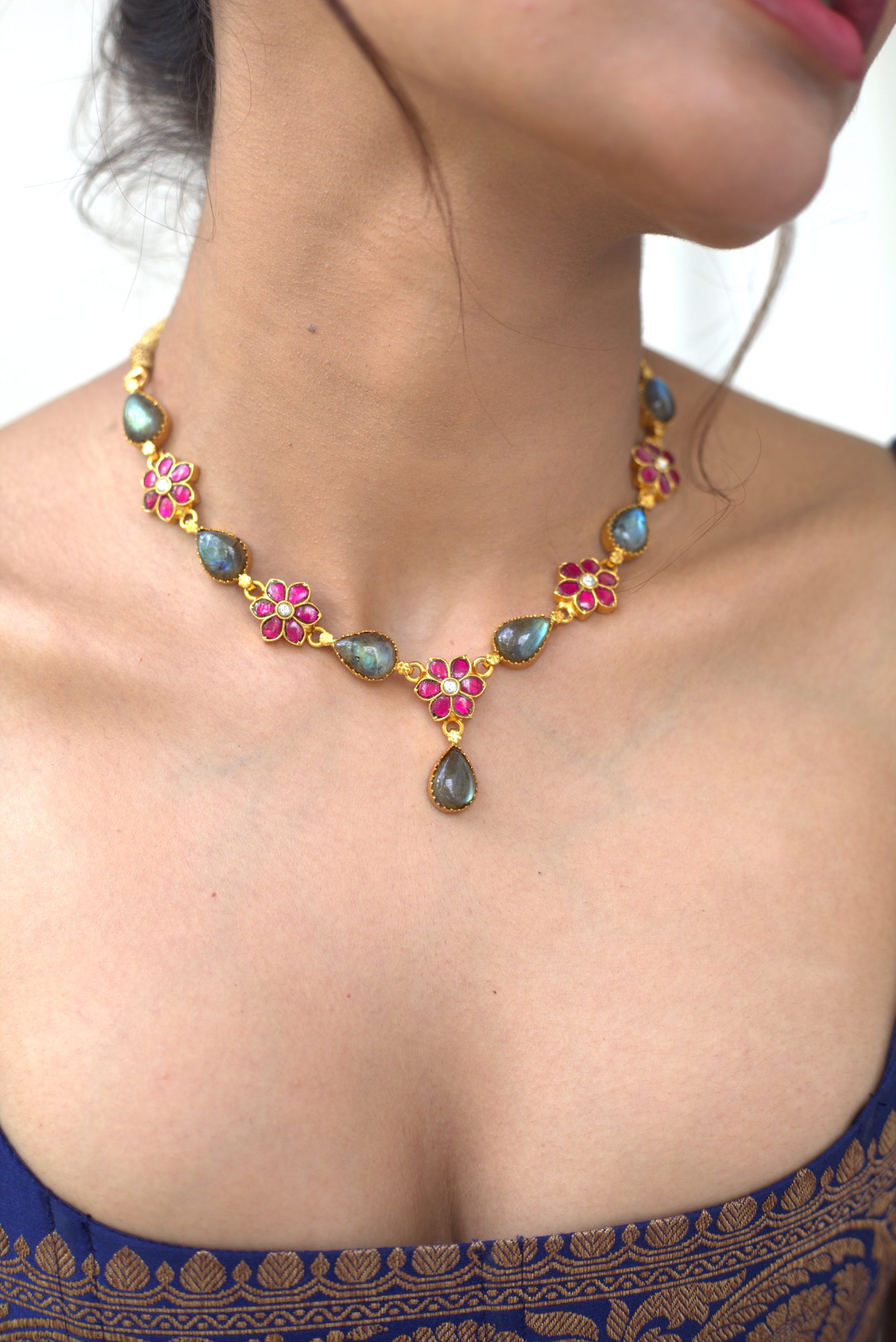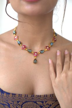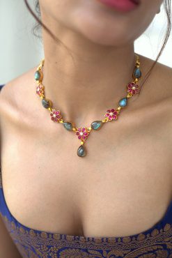Gold plated 925 Silver – Labradorite Stone necklace set with kundan works