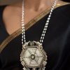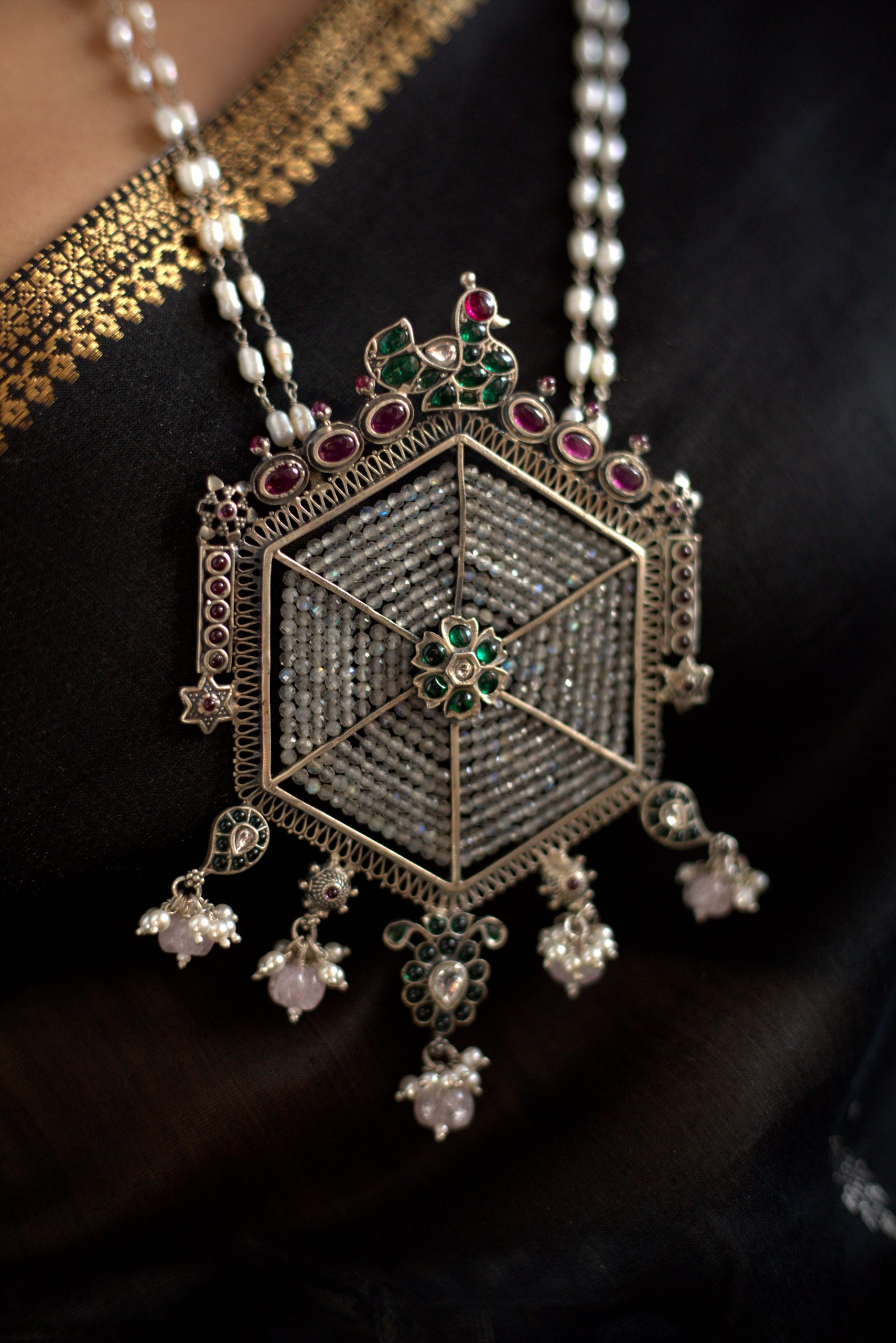 925 Silver – 2 layer long pearl chain with statement pendant with kemp stone works