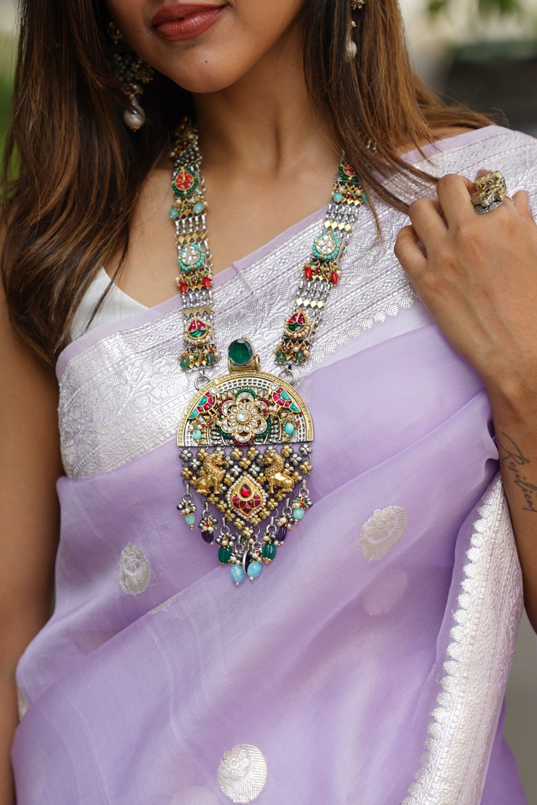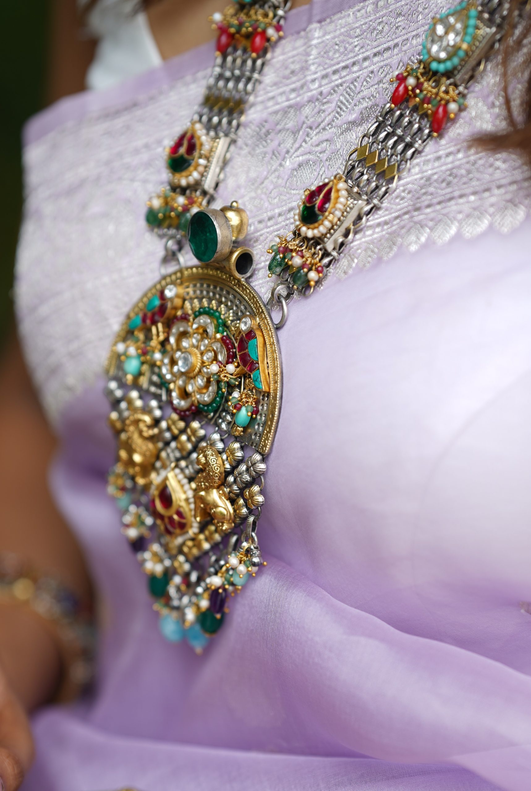 925 Silver – Dual tone long statement kundan necklace with pearls and semi-precious beads