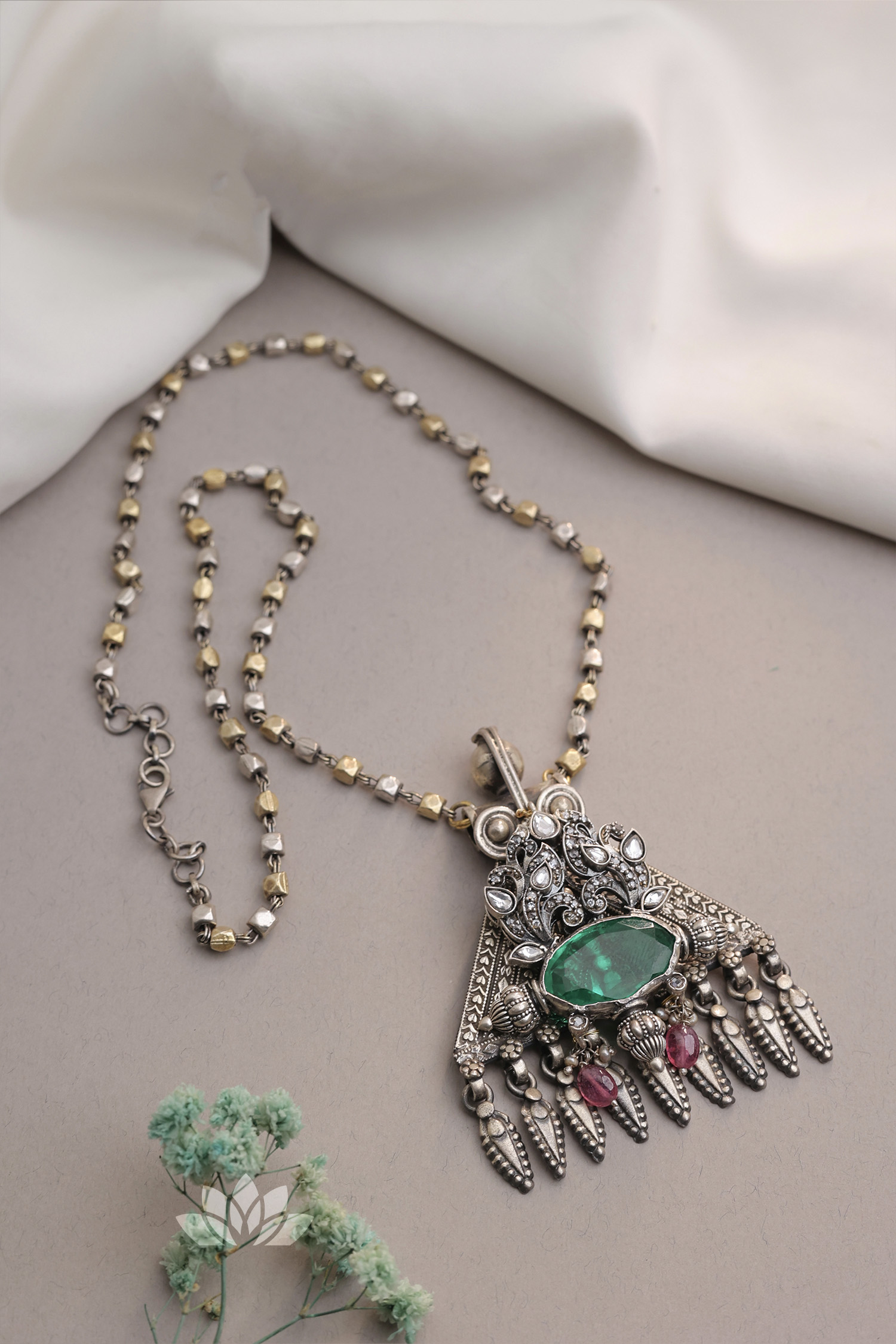 925 Silver – Dual tone long chain with statement pendant and kundan works