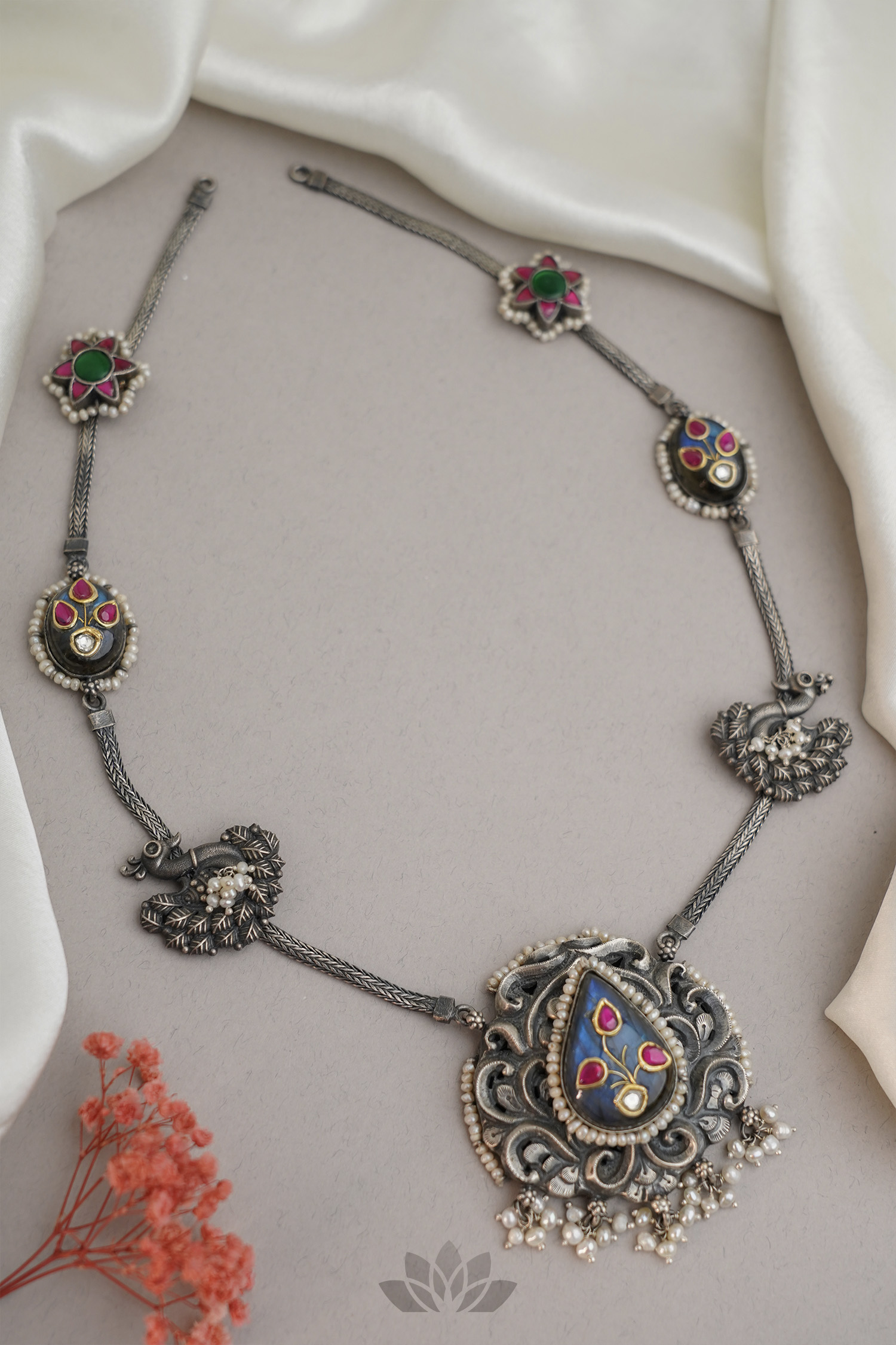 925 Silver – Labradorite stone pendant necklace with dual tone kundan jadai works
