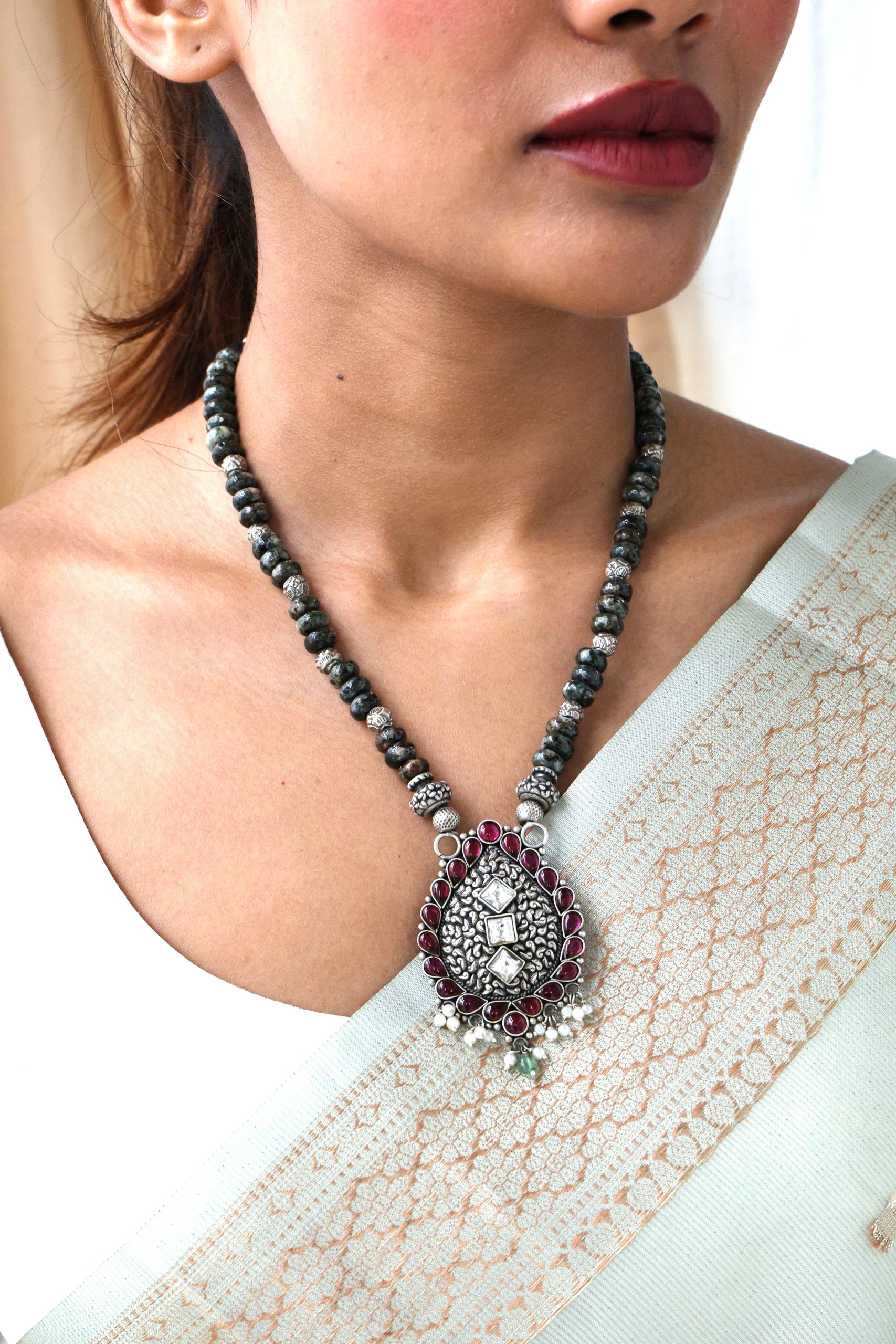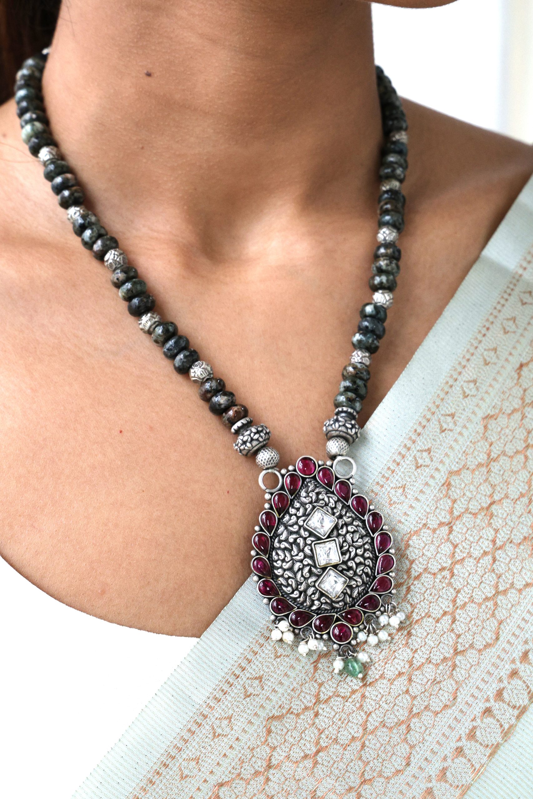 925 Silver – Semi-precious bead kemp stone nakshi necklace